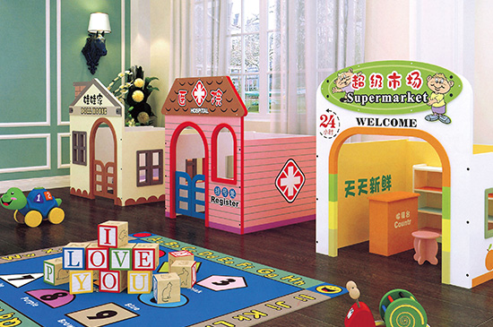 2、造型新穎 幼兒娃娃家以人的生活世界為設計原型,相當于一個微縮的生活環境。在娃娃家中有廚房、客廳、臥室、郵局、醫院、美容院、銀行等等生活配套設施,這些都是兒童將來步入社會需要接觸到的東西。逼真形象的環境情景模擬讓兒童在角色扮演和玩樂中認識生活,了解社會。