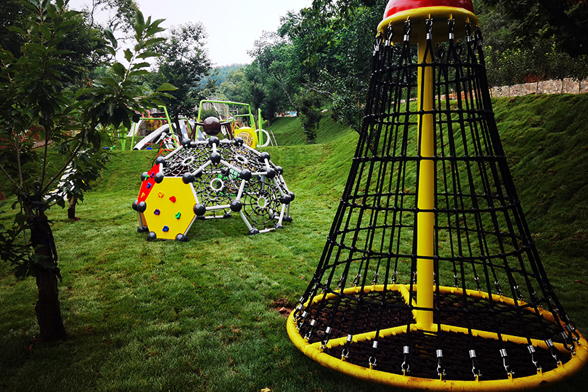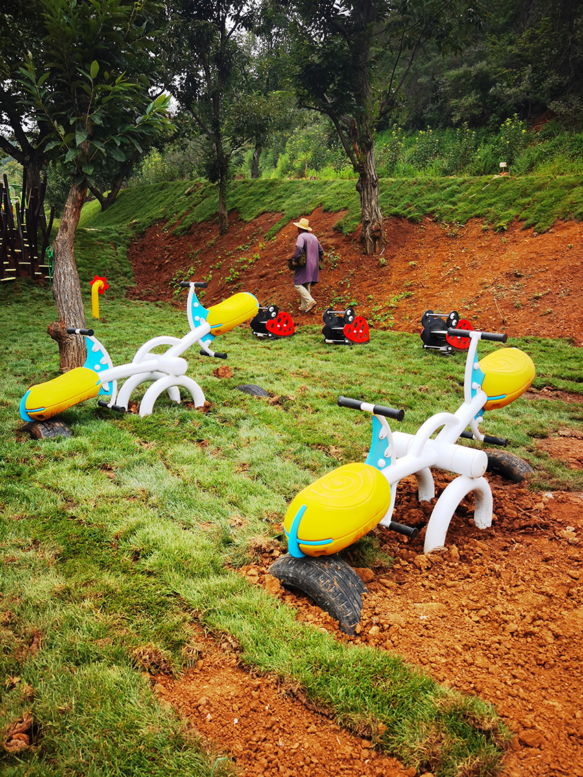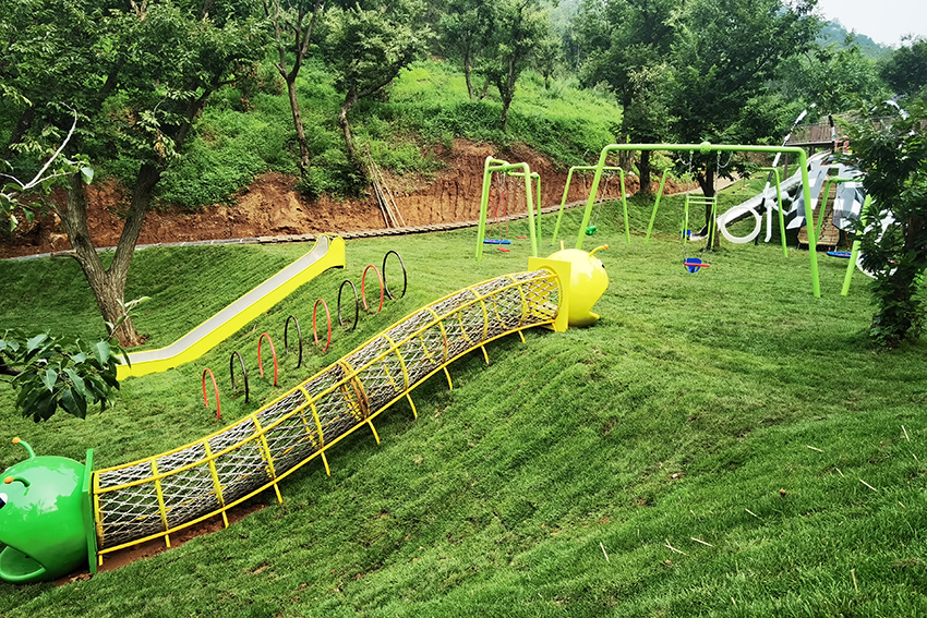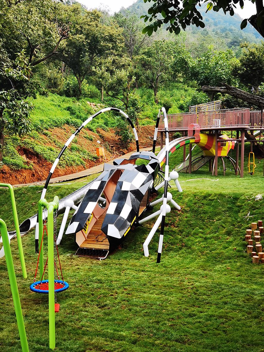 北京平谷嘻谷拾光無動力兒童樂園坐落在平谷大華鎮,整座兒童樂園以草坪為底色,結合各種動物造型的無動力游樂設施,就是一座天然的昆蟲世界。螞蟻、瓢蟲、天牛、蜻蜓…可愛呆萌極了。高樂迪將將科學和 游樂有機融入到自然之中,再結合階梯式地形建有秋千、滑梯、爬網、滑索、蕩橋、蹦床等等讓孩子體驗到鉆、攀、爬、跑、跳、滑等不同的樂趣。